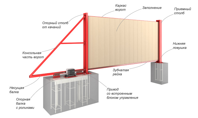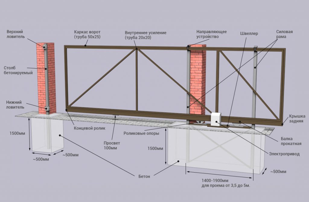 Роль конструкции несущего типа выполняет силовая рама, выполненная из металла. Ее обязательно бетонируют для улучшения основных эксплуатационных свойств. Направляющие – это элементы, которые расположены сверху рамы. Уловители находятся с противоположной стороны от данных деталей. Есть нижний и верхний элемент. Ролики устанавливают так, чтобы они находились на равном расстоянии друг от друга. Для их монтажа достаточно выделить два участка в общей конструкции.